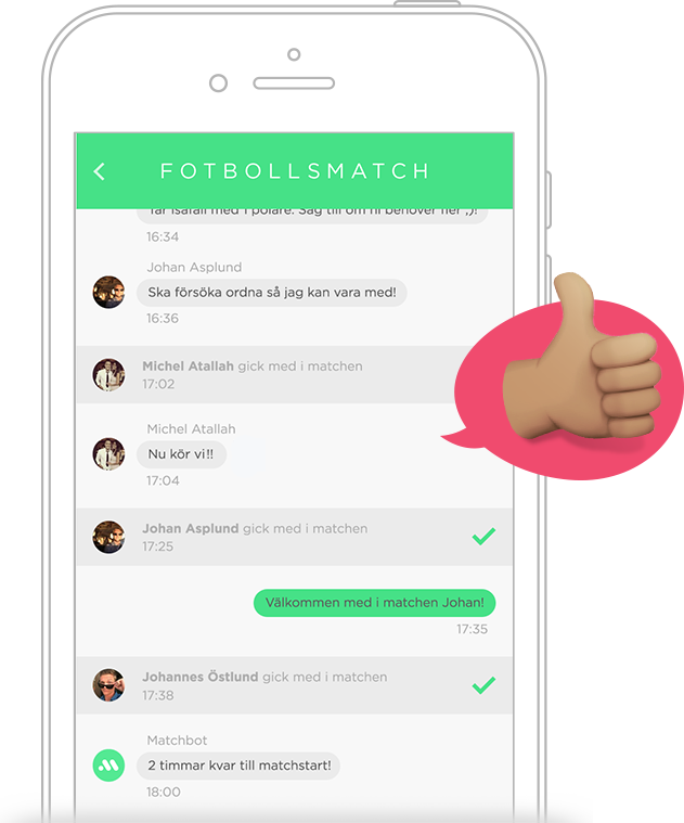 Varje match du skapar eller går med i får en egen gruppchatt där du kan kommunicera med dina medspelare. Matchbot notifierar deltagarna i realtid och hjälper dig att organisera dina matcher.